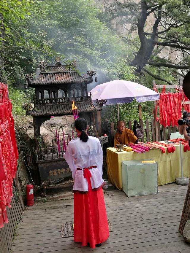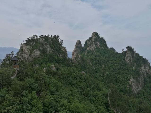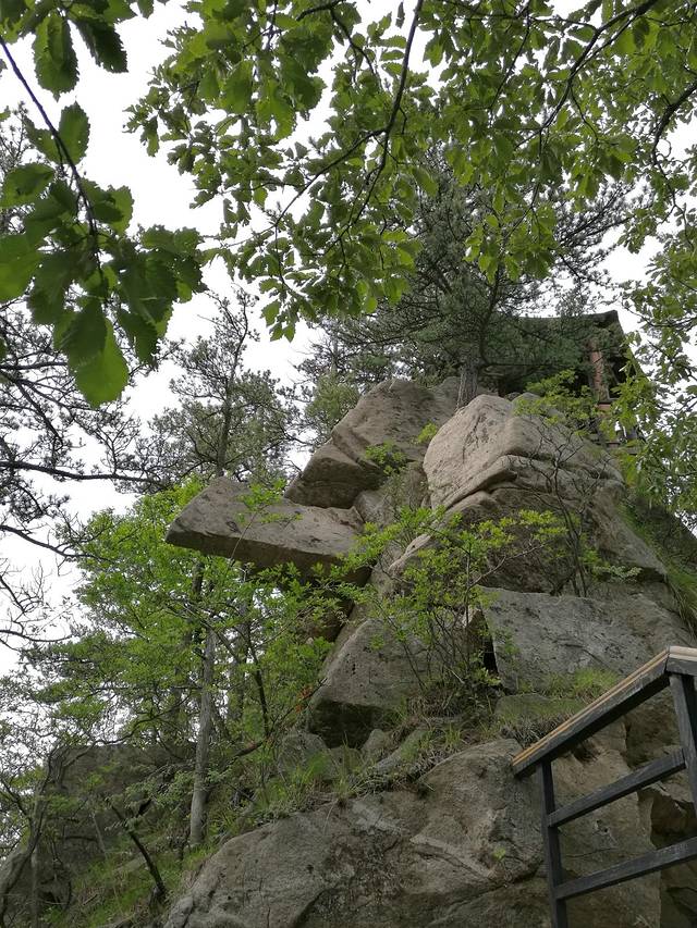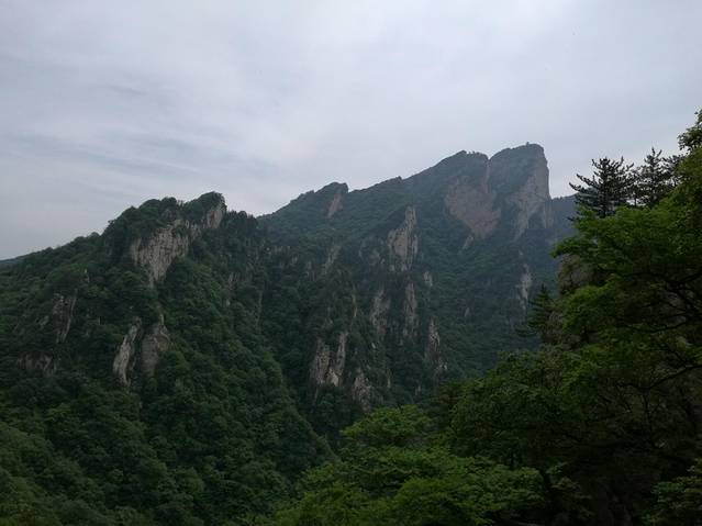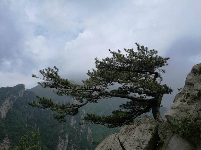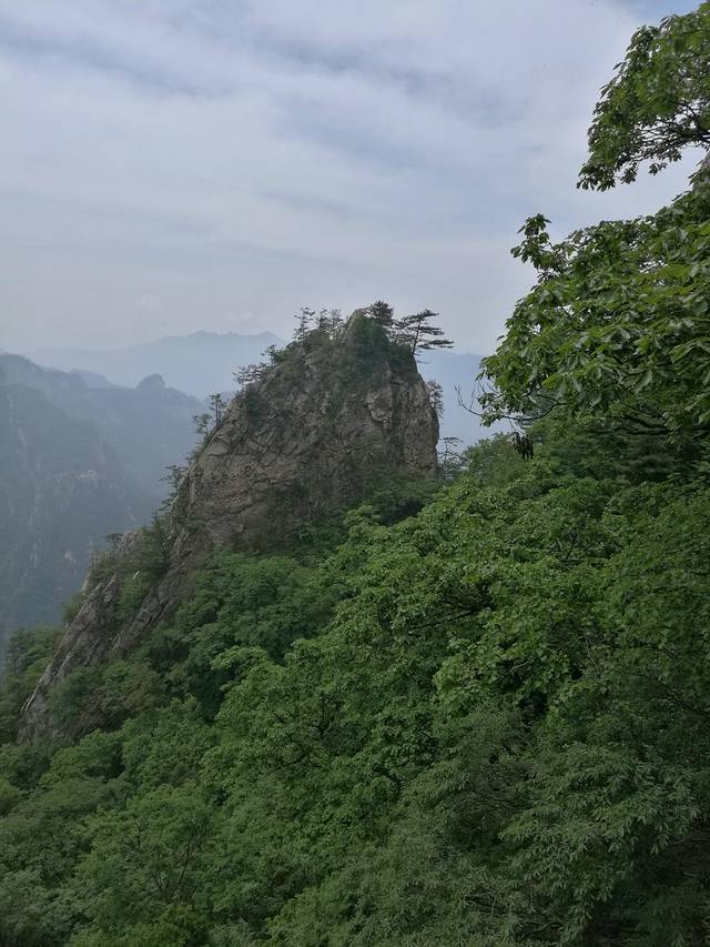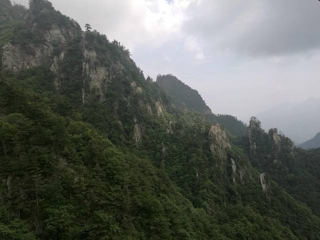 从景区大门口到索道和登山道的入口处大约有7-8公里,必须坐景交车才能,否则浪费时间。沿途有很多避暑别墅,据说夏天很火爆,想必也是的。因为听说爬山大约需要1.5小时,我们选择了索道往返。缆车上,就看到各种奇峰,怪石,青松,翠柏。如果坐索道的话,整个景区玩下来大概3-5小时左右吧,关键看你怎么玩。第二天与农家乐老板聊天,才知道也可以开车到红石峡入口处步行登山至风水岭,游玩后再原路返回。伏牛主峰犄角尖虽然在老界岭的旅游图上标明了,但从老界岭上不去,要从栾川县的龙峪湾景区进。