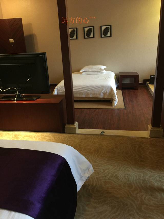 去的这天雨很大,所以入住后我们第一次宅酒店了。儿子睡了,我和老公坐在窗口看风景,外面的走廊有一排流水,流水围着湖水,岸边有一艘小渔船,雨点掉落在水面,打出点点圈圈。很有意境。