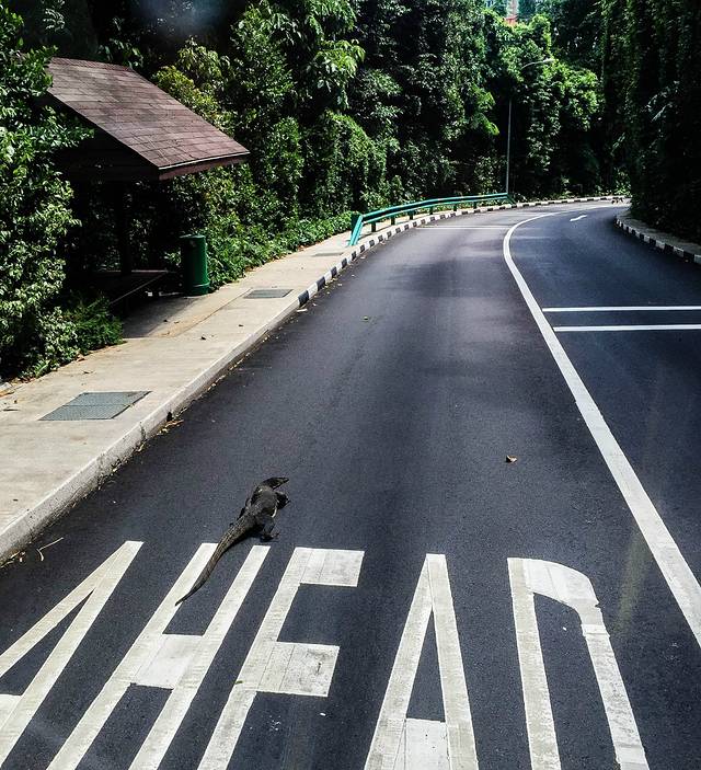 特别特别有爱的一幕。 我们坐在大巴里面,突然前方出现一只不明生物,司机特地停下来,等它爬走了再开车。