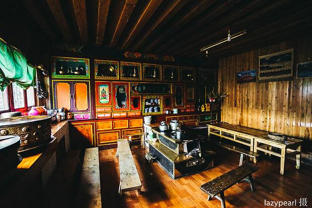 然后导游带我们去一个藏族村里的一户人家家里。主要就是给我们讲讲当地的一些风俗,然后带我们去买东西 。他们的厨房跟客厅是一起的。