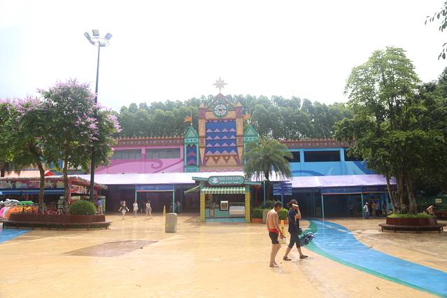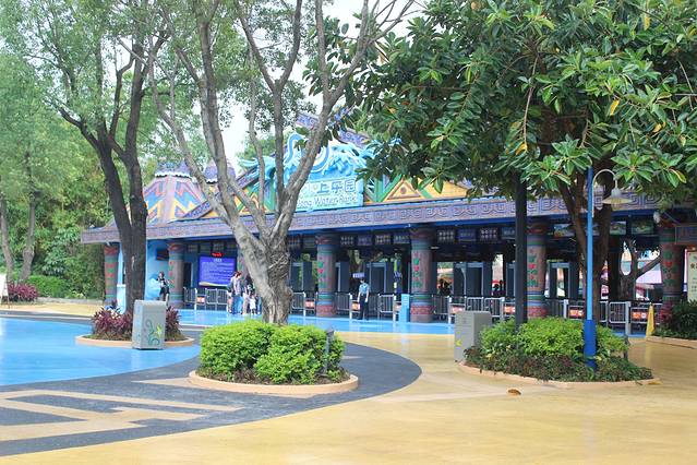俗话说贵人出门遇风雨,刚刚还艳阳高照,到了景区门口就是磅礴大雨,我们也是醉了。不过水上乐园门口绿色配上蓝色的标示很是醒目,加上萌得不要不要的卡卡虎,瞬间感觉好卡哇伊。