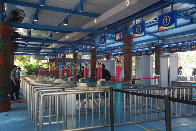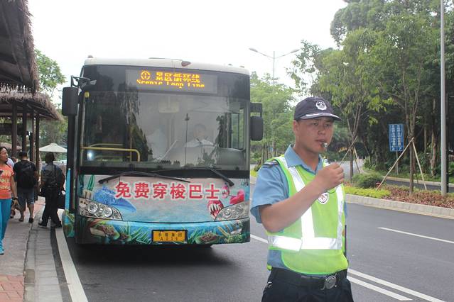 因为时间关系,加上我们刚好碰上一辆即将行驶的穿梭巴士,我们以百米冲刺的速度火速上车,穿梭巴士是木有到水上乐园站的,要坐到动物世界南门站下车,往回走50米即可到水上乐园的正门口。保安小哥还是很尽责的,发现有游客不按照正规的方向走,马上吹哨子制止,赞一个~~~出来玩,安全还是要放在第一位的。