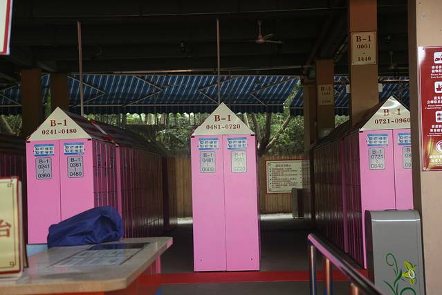 进入园区之后,正对面就是存物柜及更衣室,如果携带的物品过多及贵重的物品想要存放的,可以去租用储物柜,大柜50元/个,小柜30元/个,还要交个押金20RMB,还钥匙后便可退还押金。