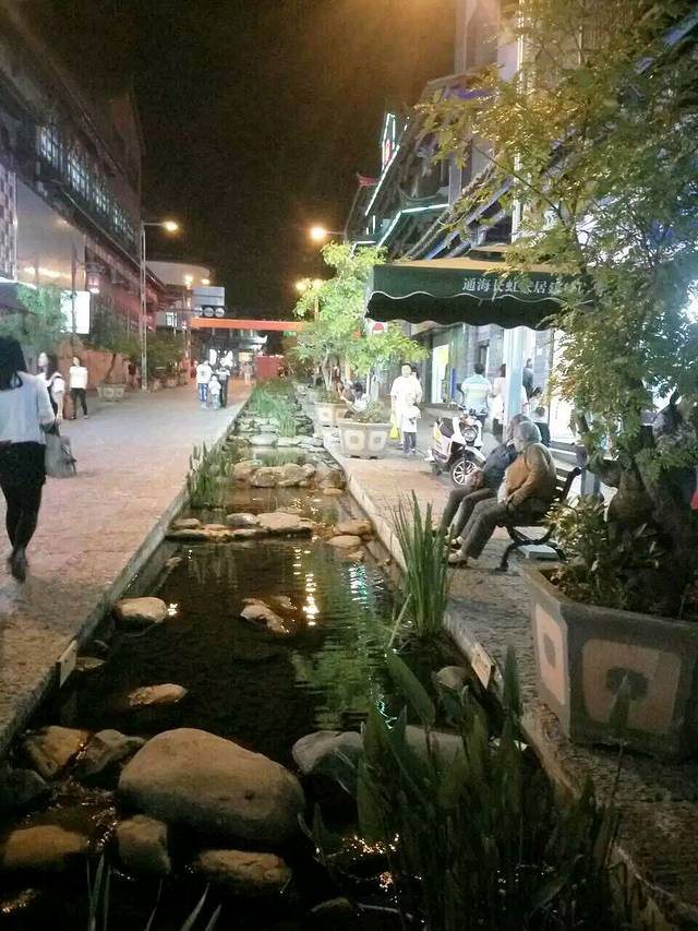 通海县城的步行街,夜色下流光溢彩,街上流水潺潺,水中鱼儿悠悠,溪面荷莲欲放,盆栽树影玲珑。如此精美古镇般的步行街,犹如漫步在溪间园林之中哦!