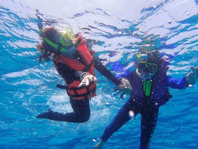 我也是第一次下水呢,之前都不会游泳,刚下水就被呛了一大口海水,这时就有船员过来询问你是否OK?然后就带着我游。看到海里的景色我表示很激动…