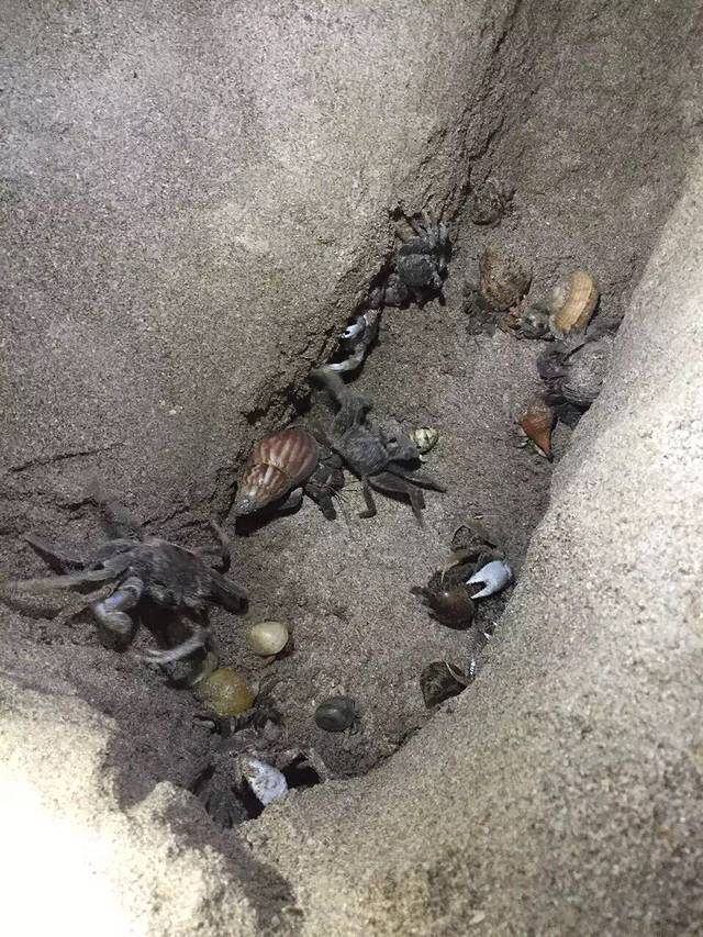 吃完回住的酒店。在酒店前的沙滩拿着手机开灯找螃蟹和寄居蟹,超好玩。我们一晚上抓了很多 最后放回去了。