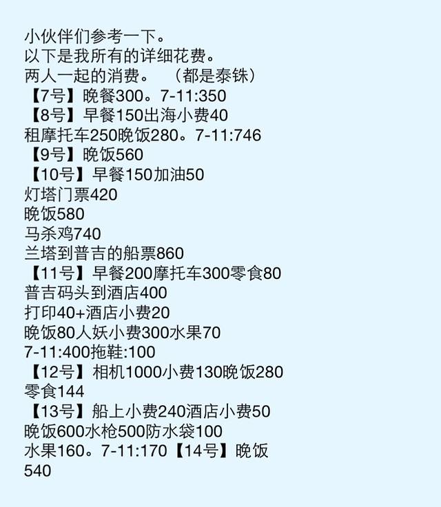 共计11380泰铢,人均5690泰铢折合人民币1073。这些就是两人A吃饭和玩的费用。
