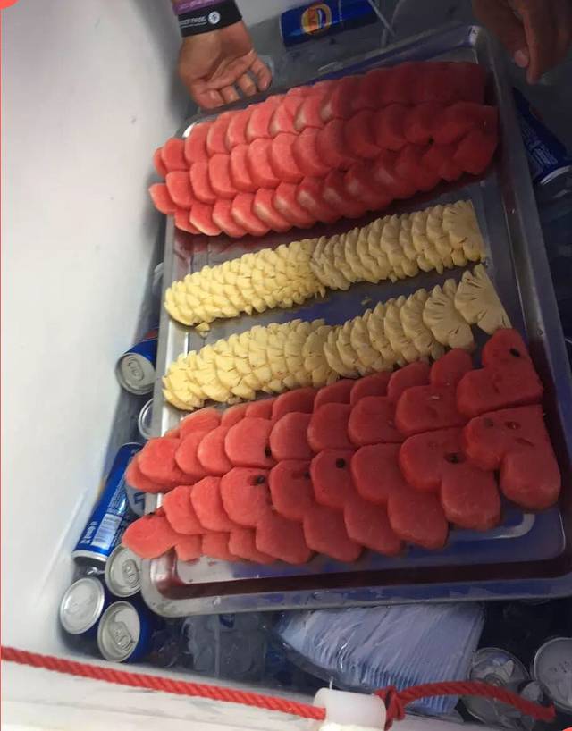 中午十一点上岸吃饭自助式,有可乐鸡腿西瓜米饭等等。吃完后在美丽的沙滩上休息到两点继续第二次浮潜。
