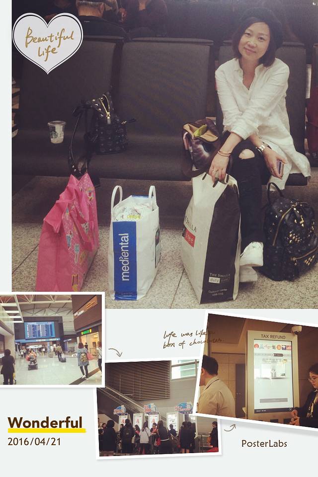 早上地接导游来酒店接我们去机场。在车上8他和我们闲聊说昨天宋仲基参加中国跑男在龙山新罗免税店,啊啊,早知道昨天我们该去看看的,国内正在热映太阳的后裔大家懂的。他把朋友发的图片给我们看,曲曲趁机保存了,之后我们发了朋友圈,羡慕死一班美眉,以为我们见到真人了。仁川机场超大,到登机口要坐地铁。我们和出团导游汇合,然后去退税取货。不是免税店买的东西可以机场退税,退的韩币,机场换成rmb。当时买东西留的单子上面标注了自己买的东西取货的登机口,而且必须本人持护照取货。我们没有留意,先到了我们的登机口才发现取货的地方好远,腿都跑软了,办好已经差不多登机了。跟其他参团的聊了下,我们只有首尔一地时间都很紧,他们还飞济州岛,每天5点过就起床,累死人的节奏,吃的东西就更不说了。所以我坚持自由行,不痛并且非常快乐,完美!