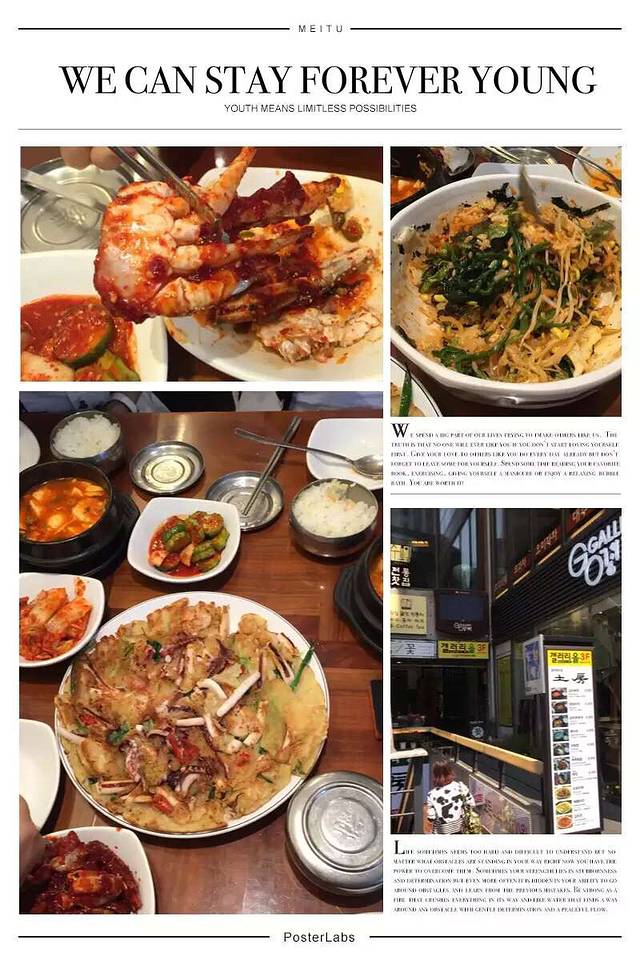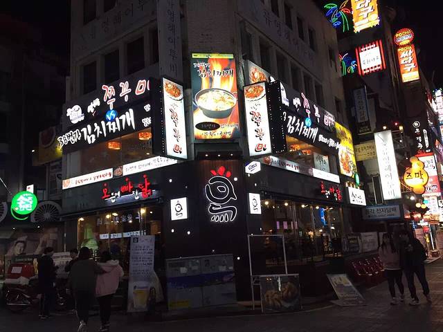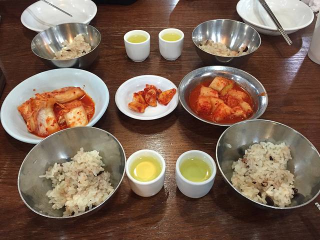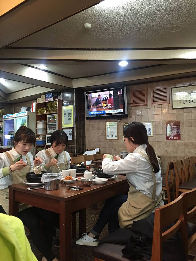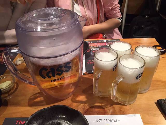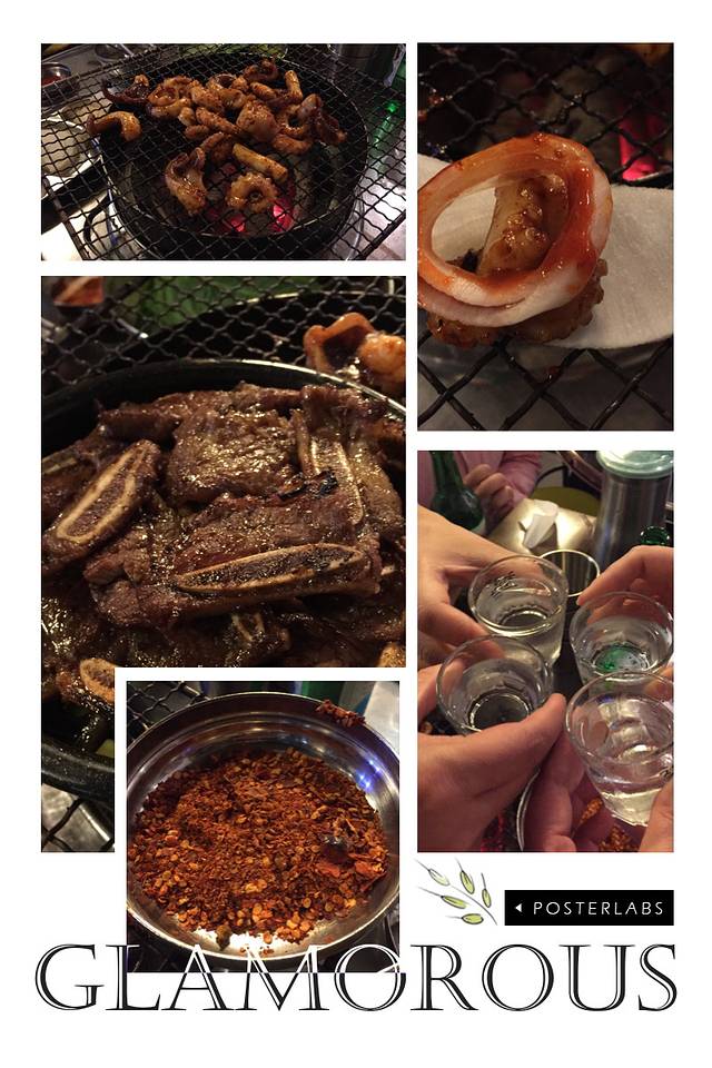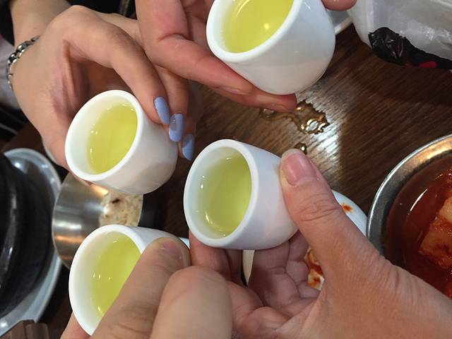 进房间东西放好,饿昏的4个人出酒店,曲曲大概搜寻了一下方向,步行约10分钟左右看到灯火辉煌的一条街,居然全是卖吃的。门口有很多招牌图片,一看就可以估计是卖什么吃的。一致筛选了一家烤肉店,一头钻进去。人不是很多,三三两两的都是韩国本地人。拿菜单点菜,我正专心用翻译器译韩文五花肉,旁边小弟突然蹲下来用普通话说,你们要点什么?笑屎我们了,一下子就轻松起来,点了牛肉,五花肉,石锅拌饭,牛骨汤等等。摆上来很多碟子,不同的沾料,小弟一直全程帮我们烤,烤肉都是非常新鲜的一大块,烤好后给我们剪成小块教我们怎么吃,太幸运了,遇到中国打工小弟,他边烤边问我们,你们怎么想到到这里吃的,为啥没到对面?原来对面是团队爱带去吃的地方,我为我们的第六感点赞!小弟说,你们不要以为其他地方也是这样的服务,不一定有哦。一母同胞嘛,我们都会心一笑。这顿饭吃的很开心,也很好吃,尝了尝著名的清酒,不习惯,觉得淡味。