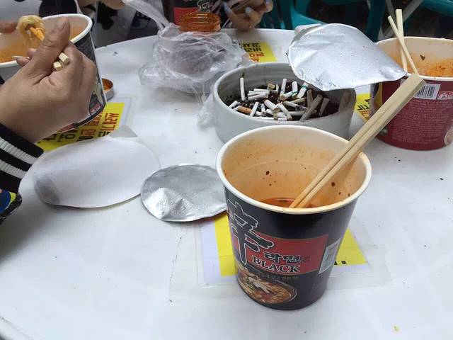 酒店不含早,早上起床收拾好去附近便利店办交通卡,顺便吃个早餐。便利店的杯装方便面琳琅满目,都备有饮水机可以冲泡。辛拉面很劲道,而且都没有油包味道却非常好。泡好去室外专门的桌上吃,看本地上班族吃完自己收拾好垃圾放门外的垃圾桶,我们也跟着做了。首尔的街上不容易看到一个垃圾桶,垃圾都是专门有地方扔的,所以必须养成习惯。