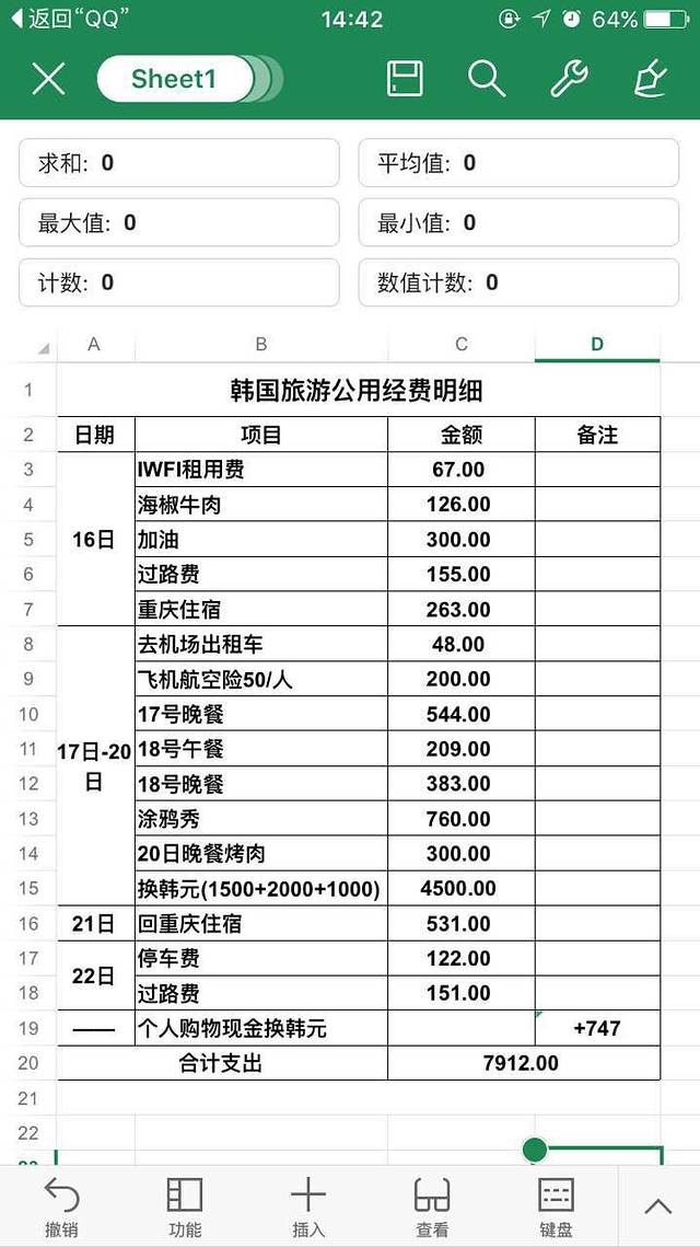 3980的机票和酒店自由行套餐,然后美人交了2000作为共同花费,刚刚用完,一分不多一分不少。附上集团长会计出纳于一身的曲妹儿的账单明细,不要太清楚了哦,赞赞赞