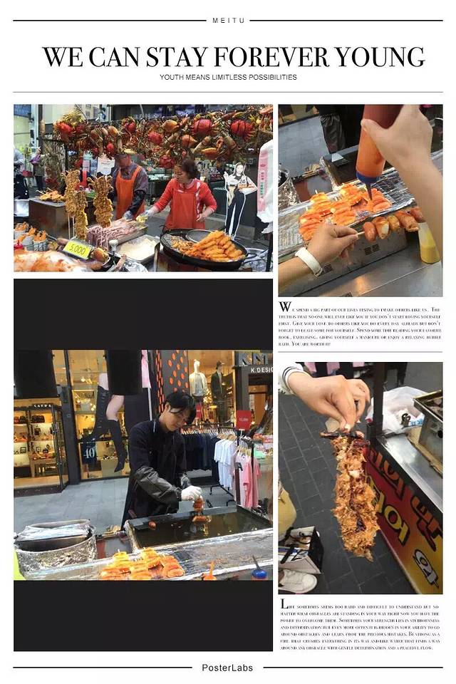 下午就在明洞逛吃逛吃。明洞就像我们的春熙路,全是购物的店铺。面膜店很多,走在路上会有人邀你进去买面膜,可不要随便乱进哦,据说有很多歪货来自中国,呵呵了。要去就到各个品牌的专门店买,我们本来在免税店买了很多面膜的,看到ahc专卖店又挪不动步了,又去买了一些来分,合起来买有折扣划算些。到明洞你会感觉到了春熙路,每个店子都有中文店员,购物全程无障碍。沿路有很多卖小吃的,去买了一些看起来好吃的尝尝。看到很多代购的妹妹拖着几个大箱子在路边拆包装,还是蛮辛苦的。