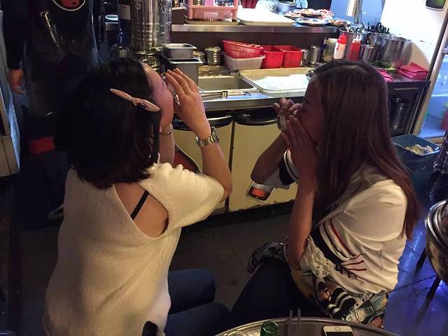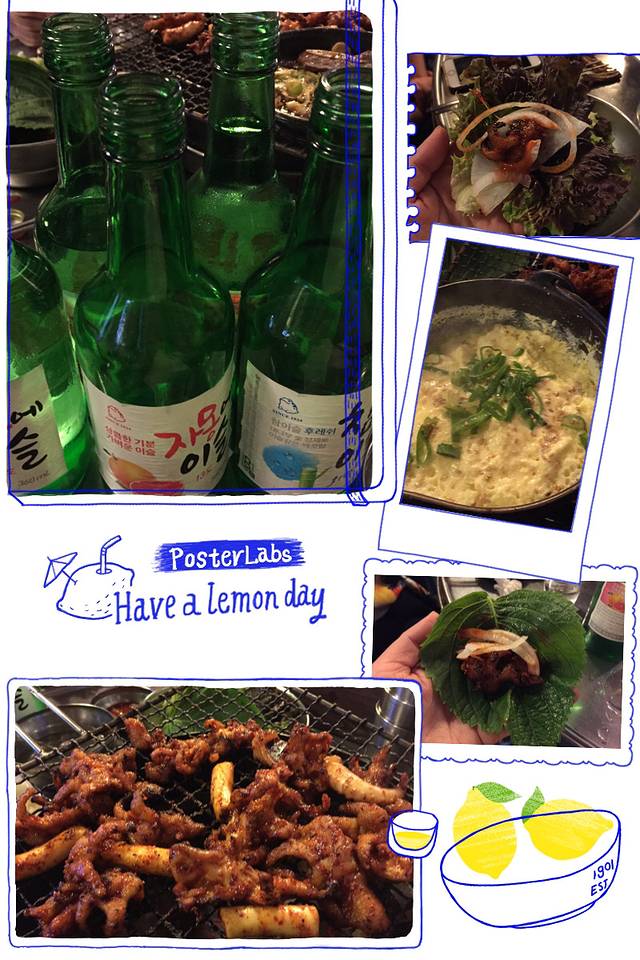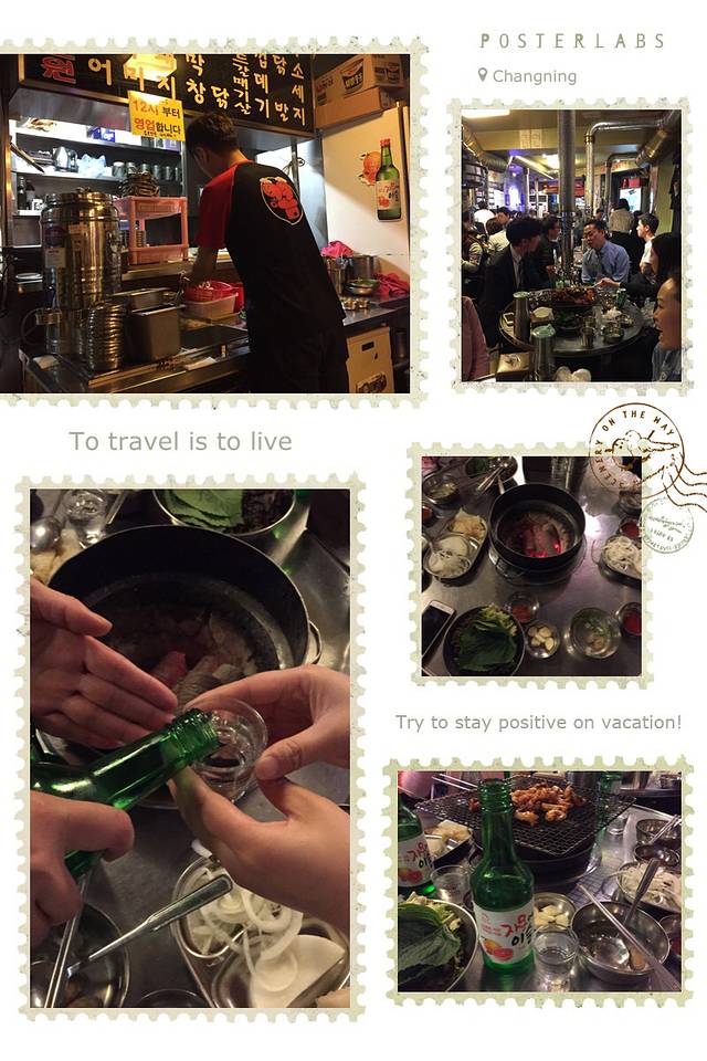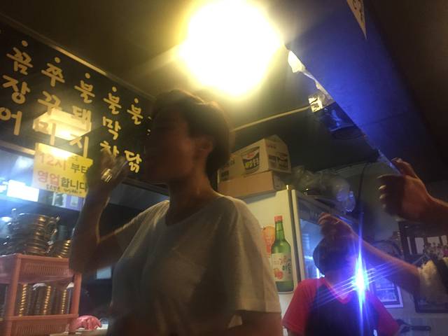 晚餐到酒店门口不远的烤肉店。这家我们每次路过看到两个师傅在门口烤,边烤还边喝酒,烤的肉看起非常好吃的样子,生意爆好,就留到最后一晚来吃。全是本地人,味道非常好吃。因为是告别餐,所以我们都放开吃,放开喝。女老板看到我们是中国人非常友善,还赠送我们蒸蛋。我们用自己的酒敬她非常礼貌地用韩国礼节背过身去喝。有个帅哥服务生看到我们用烤肉沾自己带的调好味辣椒面觉得很好奇,我们给他沾了一块叫他尝尝,他觉得很好吃,又走过来要求再吃一块,这次俊给他裹了满满的辣椒面,他吃进去眼泪都辣出来了还直竖大拇指说verygood。之前说酒淡味,这次越喝越高兴,13度相当于红酒,我们4个人居然喝了9瓶,全部喝醉了,但是很开心。