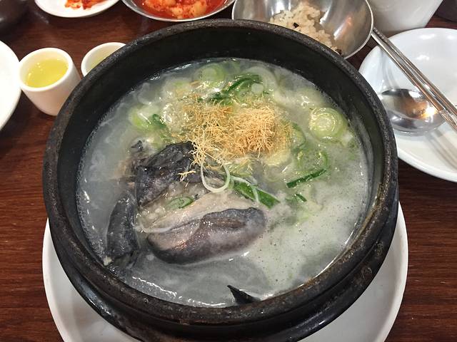 从南山塔下来到明洞吃午餐。大众点评有推荐的百记参鸡汤专门店,有中文服务员,点了她推荐的乌鸡和山参根。小只乌鸡里面包着糯糯的米饭泡在鸡汤里,旁边有三个上班的韩国妹妹正在吃,我们学着她们的样子,用筷子把鸡肉和米饭撵碎和着鸡汤吃,太鲜美了,我吃完整整一大碗。韩国到处都有卖参鸡汤的,一定要到这种专门的鸡汤店,吃到的才地道。