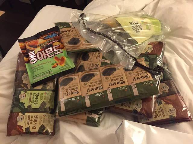 出团的领队跟首尔地接导游联系好了,我们出机场就接到我们。这就是旅行社自由行套餐的大大好处,推荐!如果是全自由行自己定酒店自己找车要麻烦很多。地接导游是个东北小伙,开了个大大的商务车接我们四个,行李装的妥妥的,还可以躺下睡觉,性价比之高。没有时间吃午饭,他直接带我们到两个免税店,不会强制你购物,但是一个免税店给你2个小时,他拿我们的一本护照去报个到,如果我们在2小时内买的东西他会有点子进。这就是自由行套餐唯一的一个安排,但是免税店我们本来就要去,又有专车帅哥接送,正好吧。先到新罗免税店,人超多,果然是面膜国,各种面膜看得眼花缭乱。韩国本土著名护肤品后和雪花秀的人超多,买好东西买单要排队,我们买了面膜,小吃,全是4个人买来一起分,有折扣。给朋友带了品牌护肤品,给老公们带了一个护照只可以买2条的烟,回去的时候机场提货。因为人暴多又排队所以2个小时很快过去了,出来把东西装上车又带我们到乐天免税店,又买了些东西已经是傍晚了。话说免税店买东西无障碍哈,全是中国人。