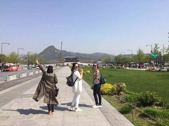 从光华门步行到景福宫。4月的首尔天高云淡,风很大,太阳很耀眼,但是一点也不晒人。走在路上悠哉悠哉。到景福宫一条笔直的街道上三三两两的人群,路边停着kbs的工作车在进行拍摄,觉得熟悉而亲切。