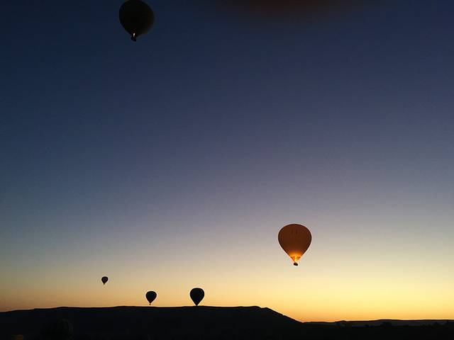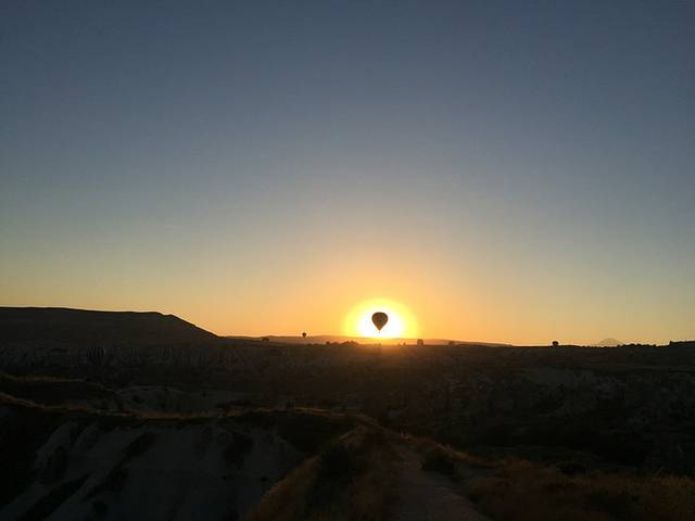 太阳升起,照在热气球上,
