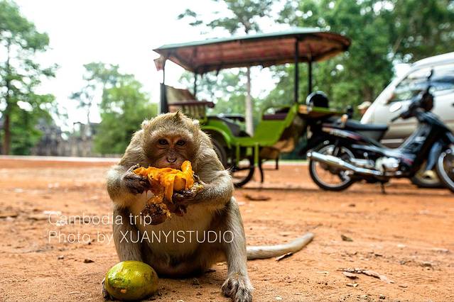 这猴子吃的芒果是从后边车里拿的,根本不管不顾,拿来坐地上就开吃。当地人也很好,微笑着看着猴子吃芒果。