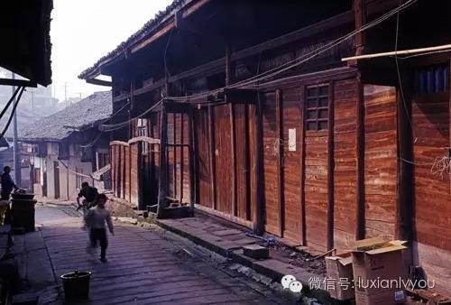 上五里、下三里的石板路通往江边,已没有了过去的水码头人来货往的忙碌与繁华,只有几株古老的黄角树 立在道旁,成为逝去岁月的见证者。老街街面东西走向,长约800米,街面是历经千年风霜,沟痕重重的青石板,青石板每块长约3米,横砌于街中央,一块块整齐地排列起来,尤为突出的是,这些石板不是平直的,而是有一定弧度,统一按照弧背向上的顺序安放好,这样整个街面形成中间高两边低,在长条石的两边分别用两块条石顺着街的走向安放,这样与中间的条石相互垂直接触,然后两边用条石砌成高 20-30厘米的街沿。