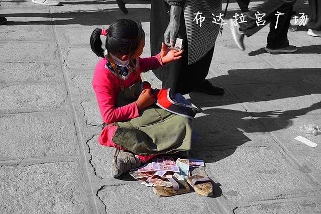 在布达拉宫广场,有很多换零钱的小孩子,因为人们去布达拉宫参观会捐赠功德钱,他们会提前准备好一元和五角的零钱供游人兑换