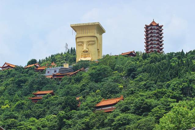 站在河堤,眺望名山,山间小庙,和玉皇大帝头像,还有宝塔构成了一副充满仙气的感觉。