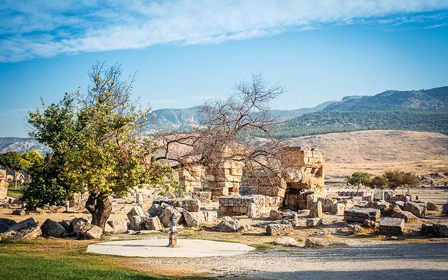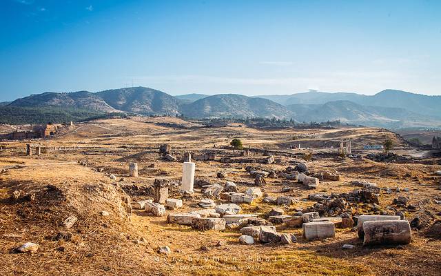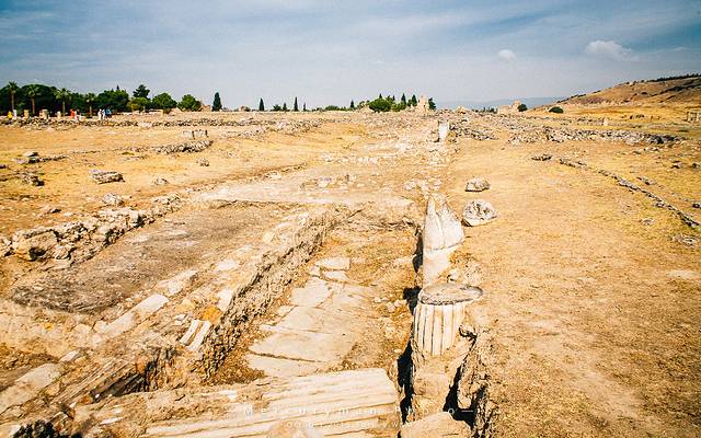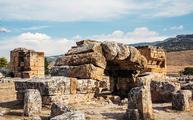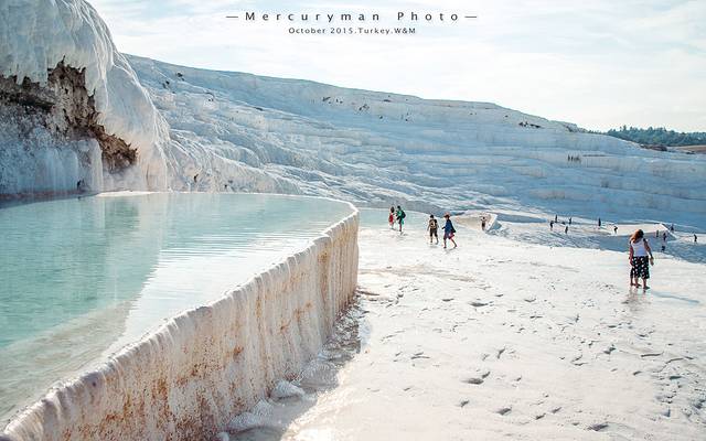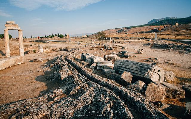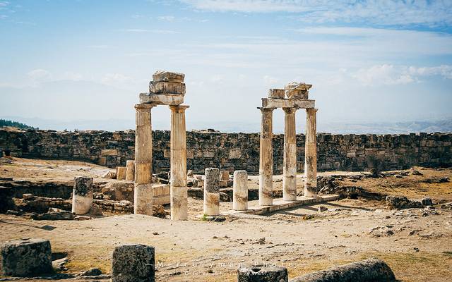 棉花堡景区和希耶拉波利斯(Hierapolis)古城遗址相连,门票也是两个景点通用。从山顶的南门进入,先游览古城遗址。这座古城建于公元前190年,因为棉花堡的温泉,罗马人在这建了一座疗养中心。这片遗址让我们队早已逝去的年代中的生活浮想联翩,当时希腊人、罗马人、犹太人、异教徒、基督徒,以及来温泉疗养的游人们在此和谐相处。后来因为频频发生的地址,城市遭到的废弃。