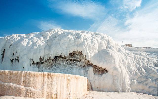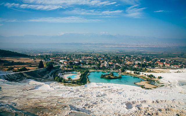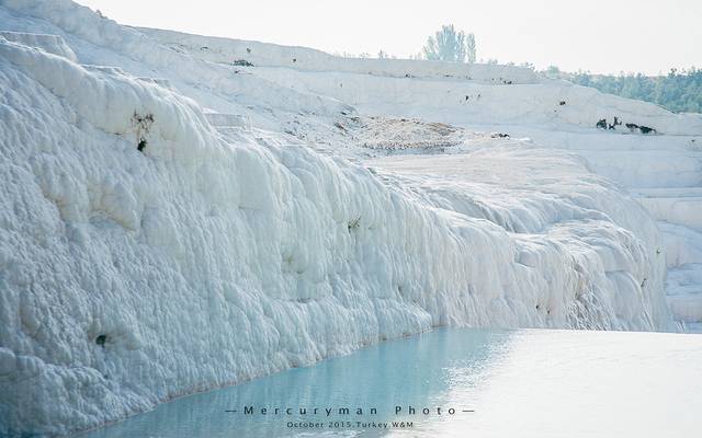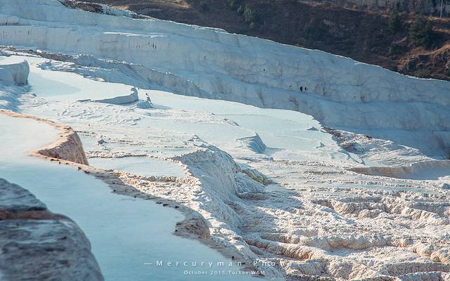 这些碟形的钙华池沿着白色粉末覆盖的山体蜿蜒下行,与明净的蓝天和下放碧绿的平原形成炫目的对比。