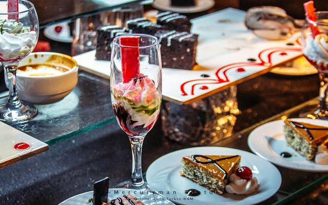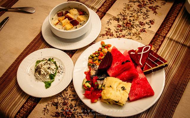 晚餐口味很黑暗~!!高露洁牙膏口味的浓汤、伪装成冰淇淋的咸酸奶(还插片火腿配色),伪装成水果的石榴汁泡酸萝卜,浸润饱蜂蜜的小蛋糕(咬一口真的需要很大勇气),还有各种混重口味香菜的沙拉,,,,只能用三个字来总结“甜”、“酸”、“怪”,对于号称世界三大美食之都的土耳其菜,真的表示很无力。。。。。