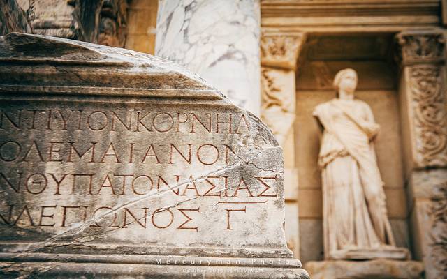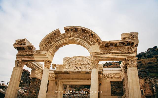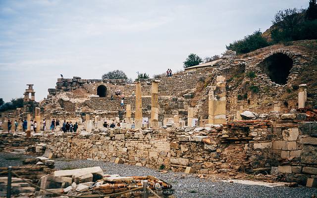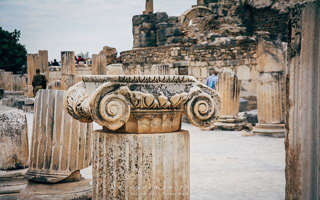 同时能见到古希腊三种石柱,可能也只有在以弗所古城。从左到右依次是:爱奥尼亚柱式、柯林斯柱式、多利克柱式。其中柯林斯柱式,柱头以毛茛叶纹装饰,而不用爱奥尼亚式的涡卷纹,这种柱式直沿用至罗马帝国时期。