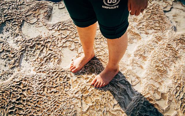 游览钙华池必须赤脚脱鞋,目的是为了保护这独一无二的方解石表面,不得不说,赤脚走真的很痛~!!