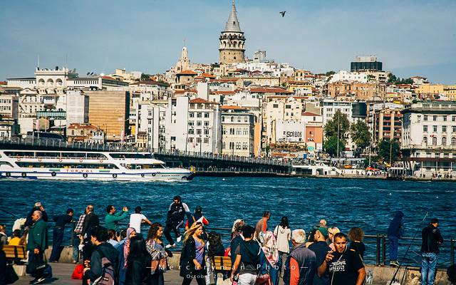 远处山坡上圆柱形的就是加拉塔塔,如哨兵一般魏然俯瞰着伊斯坦布尔。它建造于1348年,几个世纪以来都是城市中最高的建筑,现如今它依然主宰着金角湾以北的天际线。