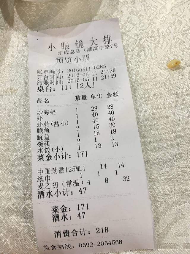 终于找到许多攻略里提到的小眼镜大排档,味道不错,价格也可以接受,人均100元