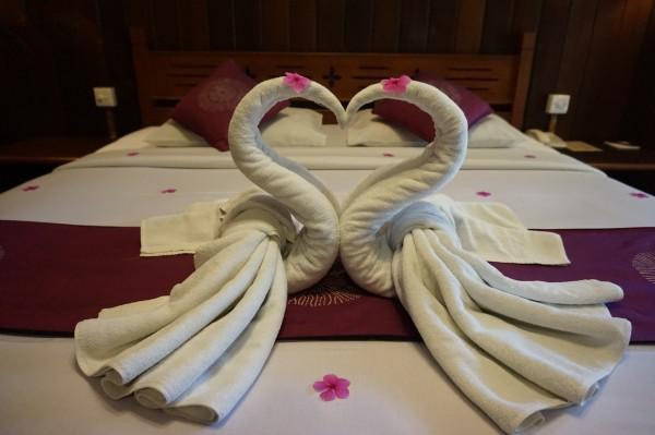 午餐结束,度假村给我们安排房间,我们的是豪华园景房,度假村给我们安排了房间内的蜜月布置。