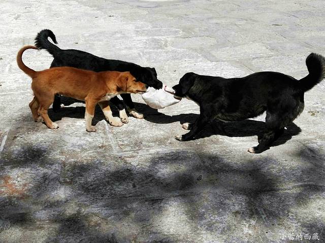 寺院里的三条小狗在争抢一顶帽子,也许是养在寺院里又受佛法的熏陶,使得它们懂得在这个圣神的地方要庄严要静谧,即便是在争抢东西也不能发出吼叫声,只是很安静的在拉扯着,更完全不理会从它们身边经过的行人。