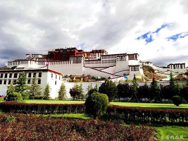 过了安检,进入布达拉宫脚下的花园,抬头看那耸立在以蓝天白云为背景的绿草地上,金灿灿的阳光洒满它的身体,现在的它是那么的慈祥温柔。