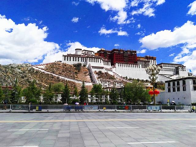 终于行驶到离它较近的地方,我屏住呼吸,不断地按下快门,想要把布达拉宫的身形拍下来带回去慢慢欣赏。它最是堪当“雄伟”二字,依山而建,重叠错落,殿宇嵯峨,气势浩大。在蓝天白云的衬托下越发显现出它那种气贯苍穹之势。瞬间想到了仓央嘉措的诗句“住进布达拉宫我是雪域最大的王”。