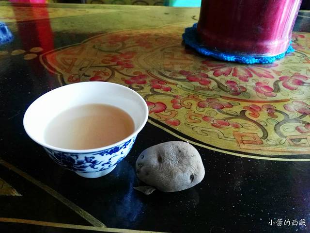 这是卓玛家里的老阿妈早上起来新熬的酥油茶,旁边的小土豆是她家里自己种植的。这两样看似很平常的东西就是年木乡这个村庄里家家户户的必备食品,也是招待客人最好的美味。酥油茶我确实是喝不习惯,但是小土豆的味道还是很不错的,毕竟是纯天然无污染的绿色食品嘛。