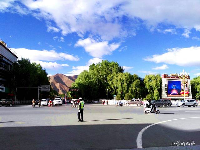 人行横道上也是稀稀拉拉的行人,他们都面色从容,缓缓而行完全没有赶时间上班急匆匆的样子,城区的道路都是干干净净的,暖暖的阳光照下来,让我瞬间觉得拉萨是个幸福指数颇高的城市。