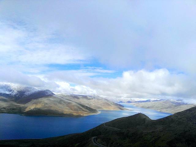 车子大概行驶了三个多小时后当达到山顶就能看到圣湖之一的羊卓雍措的身形了。在山上向下眺望羊卓雍错湖,碧蓝的湖水在山坳之间流淌,仿佛是一条蓝色的丝巾系在山坳之间,是那么的柔美,空灵。传说羊卓雍错是西藏最美丽的女子化身,是爱情湖。在湖边真诚的祈祷,她就能听到,能赐予祈祷者美好的因缘,夫妻一起祈祷能保佑婚姻幸福美满。