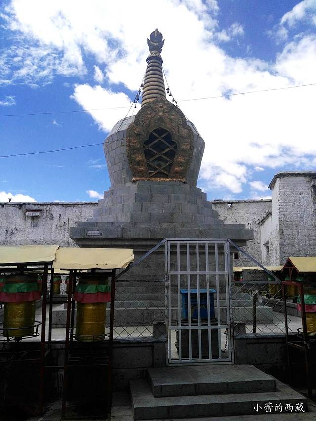 一进寺院大门就能看到这种在藏传佛教地常见的白塔,它是藏经塔,也叫经塔。在它的周围有很多小的转经筒,前来朝拜的藏族信徒们会围着经桶和白塔诵经祈福。