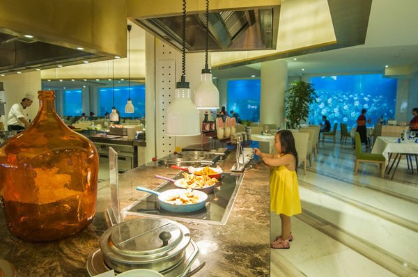 海蓝餐厅一次性可容纳300人同时就餐,与其他海底餐厅不同的是,海蓝首推住店客人早餐权限,即凡是入住酒店的客人,所含早餐均在海蓝餐厅欢快享用。早餐种类丰富多达百余种,选材制作亦是精益求精毫无松懈。清晨时分,阳光初现,落座于海蓝餐厅的任意一隅,舒心畅快的海滨度假之旅已然启程!