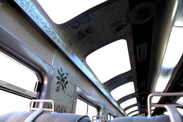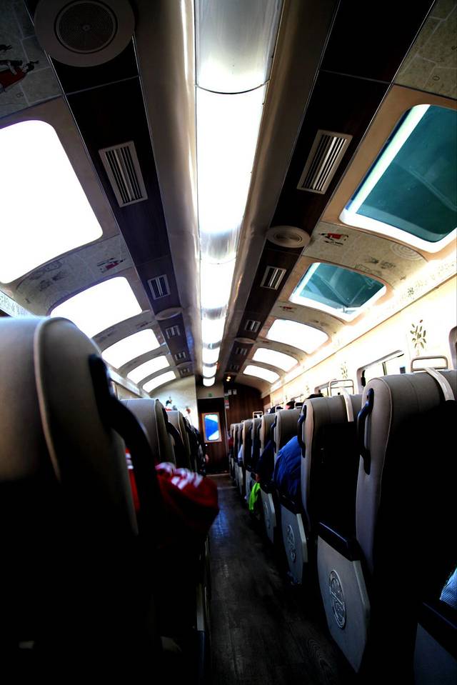 车厢貌似很新很舒适的样子,车顶还有两排大窗供人欣赏风景。看着比欧洲之星强多了。
