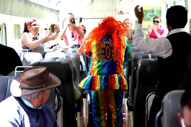 仔细看看我们这列火车,原来只有一节车厢,连单独的车头都没有,感觉跟轻轨差不多。本来觉得旅行结束,会略有惆怅,没想到这一路非常欢乐。首先是列车员换了打扮出来给大家跳舞。