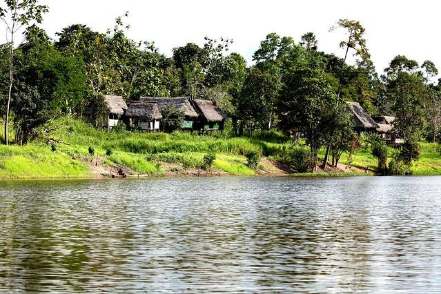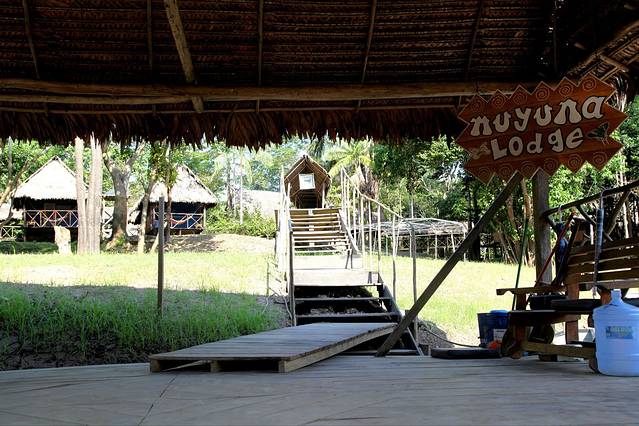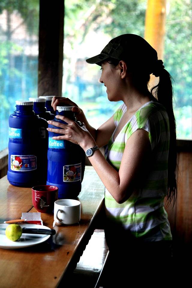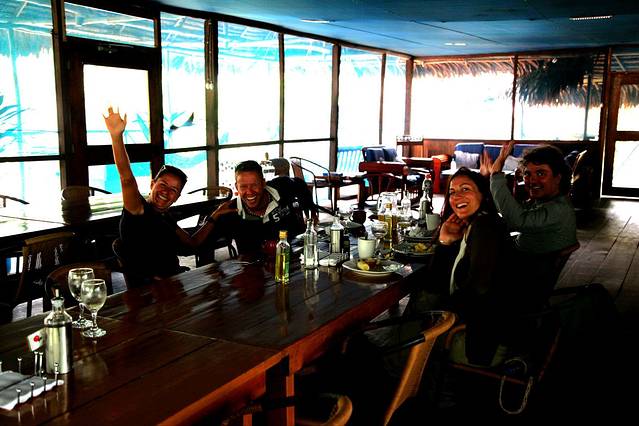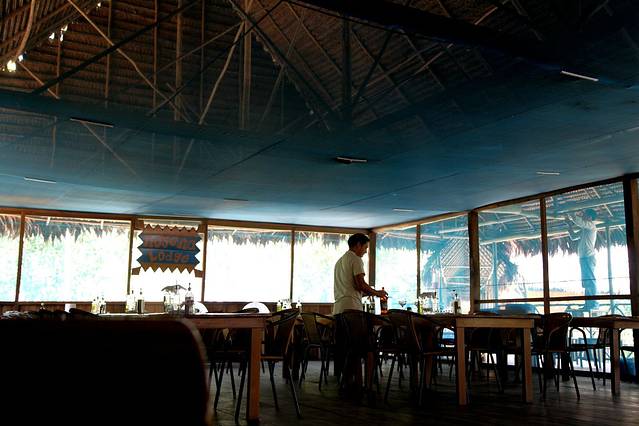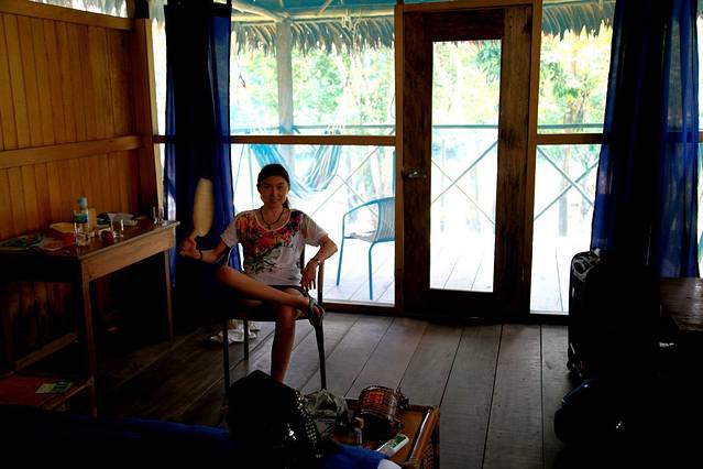 Lodge的中心活动区是饭厅,放着两大长条桌,若干沙发椅和一些棋牌、杂志,供大家打发时间(这里也上不了网,没电视看,没广播听,让现代人怎么活呢)。很快给大家分组安排了导游,我们和一对美国来的couple一组(男Victor,女Adrina),导游叫Rafael,40来岁,略微黑胖。Rafael跟我们介绍,每天什么时候开饭,每餐都是自助,平时在饭厅有热水壶里面有开水,可以泡茶冲咖啡,还有水果随便供应,其他饮料或零食要另行购买。要注意防蚊和防晒,其他的就不用操心跟着他玩就行了。