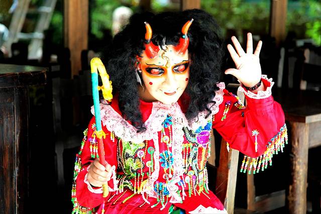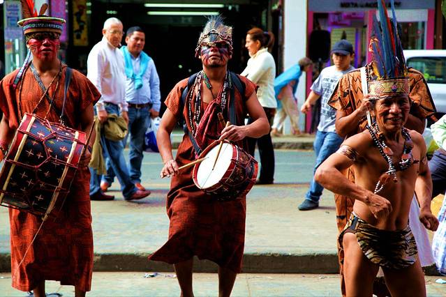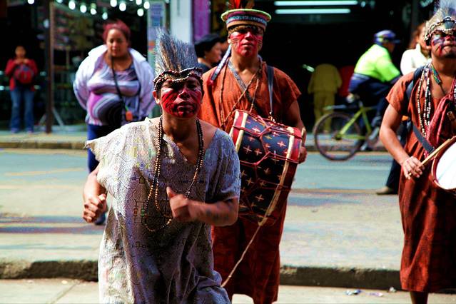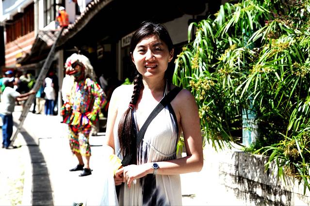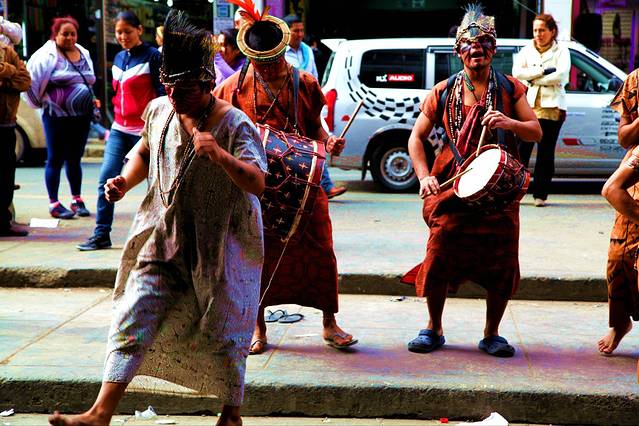 看当地人吃排挡也觉得很香,联想到在墨西哥Marida的集市吃排挡,味道跟餐馆里的很是不同,就又动心了想找个台子坐下吃点啥。正寻摸着,忽然就在眼前的一个台子上钻出一只巨大的老鼠来,很大,大概有一尺来长,顺着台子往食客中间跑去,只听见人群中一片尖叫。骚乱很快过去,但是吃的心思打消了。虽说对于排挡的卫生没那么在意吧,可都眼睁睁看着跑出这么大只老鼠来了,心理上确实是无法接受呀。Market很快逛完,出来的时候,门口正有打扮成原住民模样的人在载歌载舞。