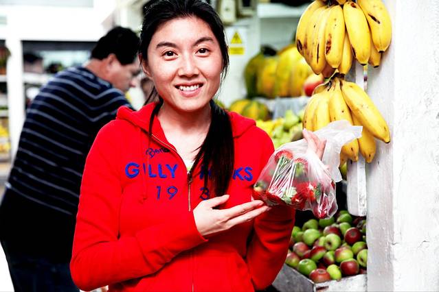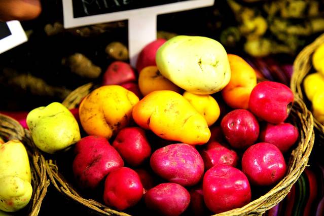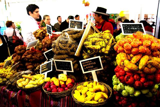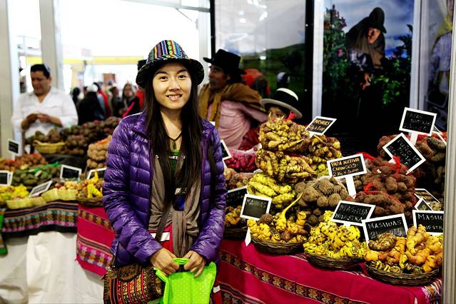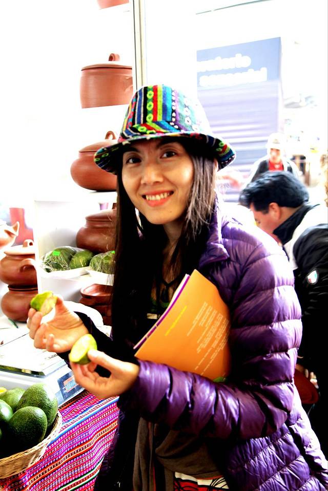 吃完午饭,想去参观一下书上推荐的早期殖民地风格的民居Casa Aliaga,结果门口打扫卫生的说主人家在午餐,让下午三点以后再来。于是步行去Central Market闲逛。当地人在这里交易农贸产品、小商品,以及吃拍档。当地的玉米颗粒硕大,令人震惊,觉得原来吃的那些什么甜玉米之类的都弱爆了。时令水果很多,西瓜、蜜瓜、草莓、芒果、西番莲、柑橘、香蕉等等,而且都很便宜。草莓个儿出奇的大,买了一袋,才2索尔。比伦敦便宜多了!