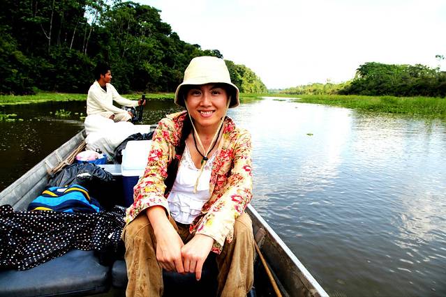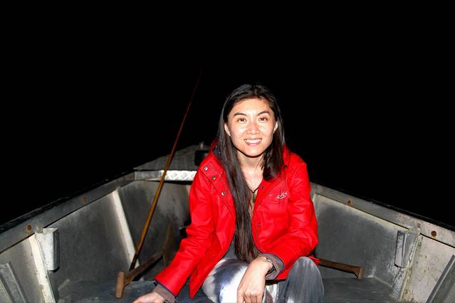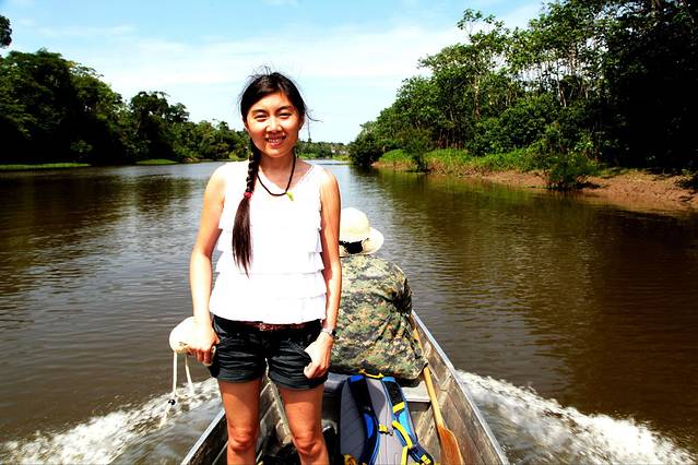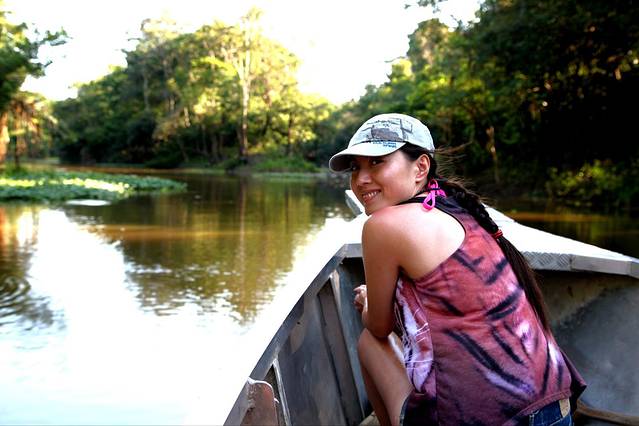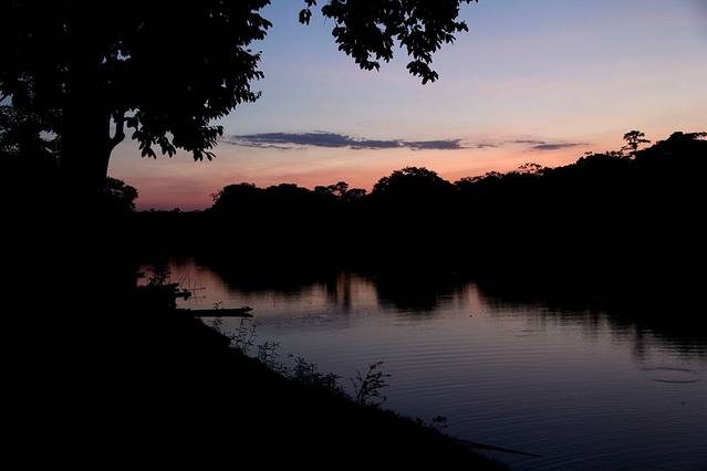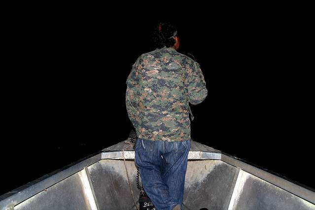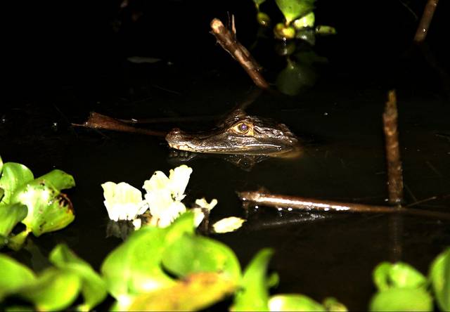 晚饭后的活动是继续坐船游河,去寻找凯门鳄。这回Rafa嘱咐我们一定要穿长衣长裤因为蚊子会很多,另外要带雨衣……收拾了一番,抹了一身号称最强配方jungle formula的防蚊水,戴上头灯,登船出发。河面上黑黢黢的,完全不似城市里那么亮堂。马达安静下来的时候,听见远处小虫啾唧,还有河里的鱼受了惊吓时不时蹦出水面,有时就蹦到船里来了。