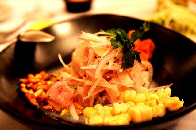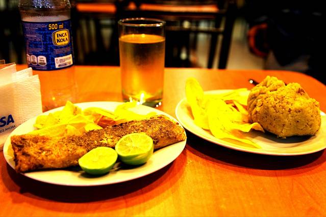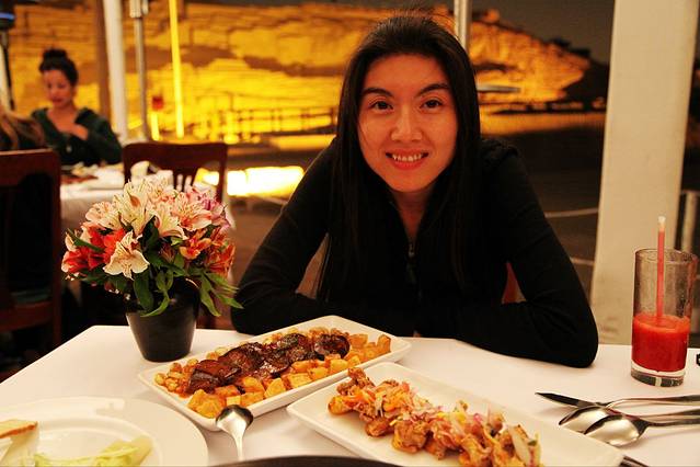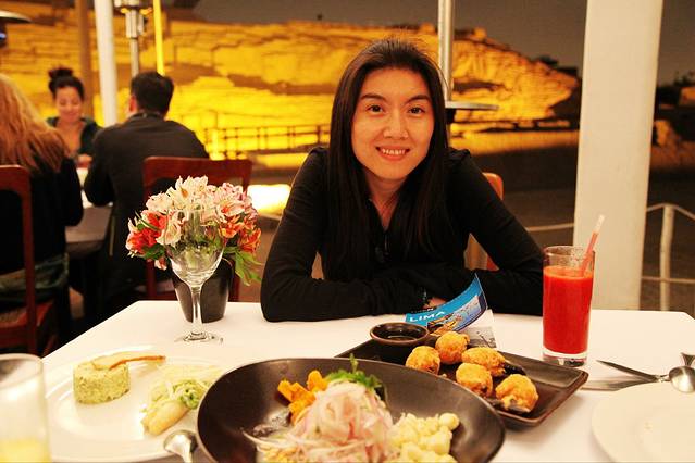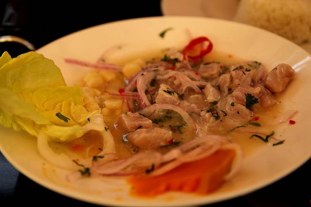 中午在Lonely Planet推荐的Tanta餐厅吃饭。点了秘鲁鱼生Ceviche,就是柠檬汁腌生鱼配上大玉米豆和红薯。还有传统的牛肉饭Lomo Saltado,我觉得味道有点像中餐,后来一查,果然是融合了中餐的做法。据说,秘鲁的饮食文化在历史上受到了各个不同地方的影响,包括欧洲(侵略者)、中国(华工……)、日本(移民)、南美其他国家等等,结合当地食材、调料和饮食习惯,加以改良,所以种类很多,口味各异。利马也因此被有些人认为是美食之都。我个人的感觉,至少中午这两个菜都挺好吃。同时还品尝了当地著名的sour酒,这个就很一般了,可能本来也不喜欢白兰地的味。