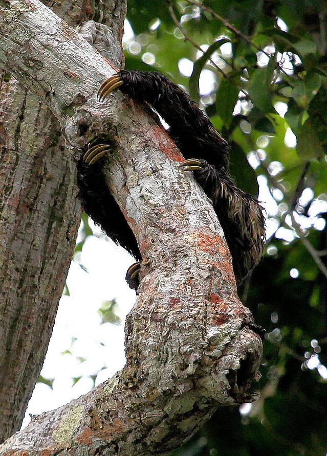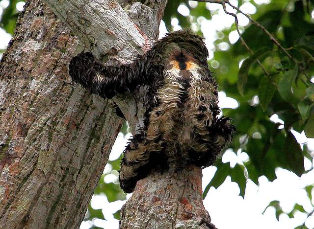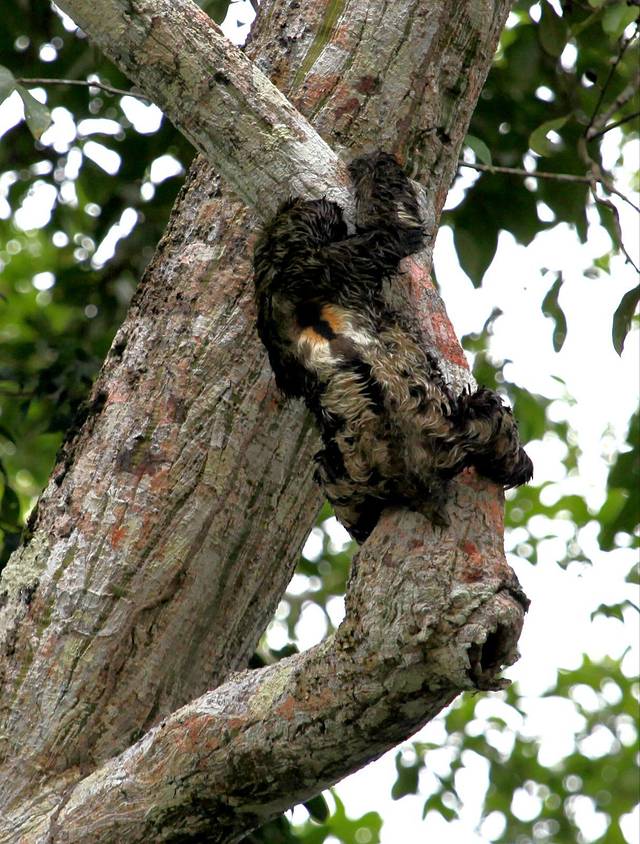 下午三点,坐船出去钓鱼。这回队伍比较庞大,一船上大概坐了10来个人。照例地走走停停,用望远镜观察两岸隐蔽处有没有藏着什么动物。很快又发现了一只树懒,难得的是它正在从树梢往下爬,不像以往看到的都一动不动地抱在树上像坨屎。原来这货在树上爬的还挺快。